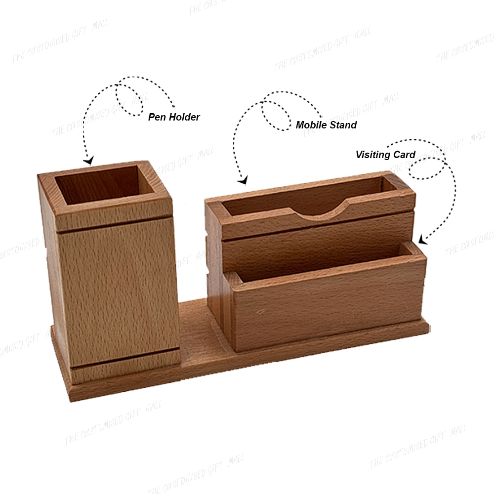 This stylish wooden pen stand is a perfect combination of simplicity and functionality. Crafted from high-quality polished wood, it features a spacious pen/pencil holder along with an additional compartment for storing mobile phones, remotes, or stationery items. Its smooth finish and elegant design make it an ideal choice for office desks, study tables, or as a thoughtful corporate gift. Designed to keep your workspace tidy and organized, this pen stand adds a touch of sophistication and professionalism to any environment.