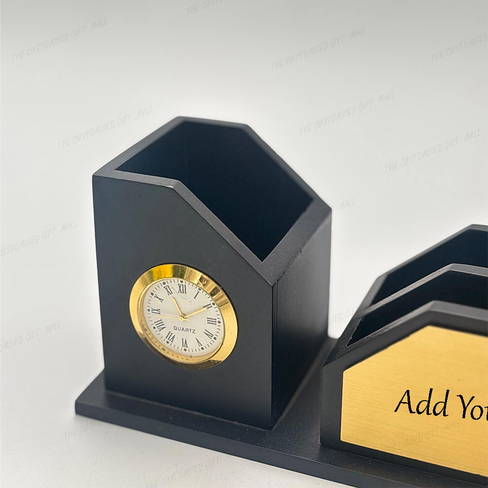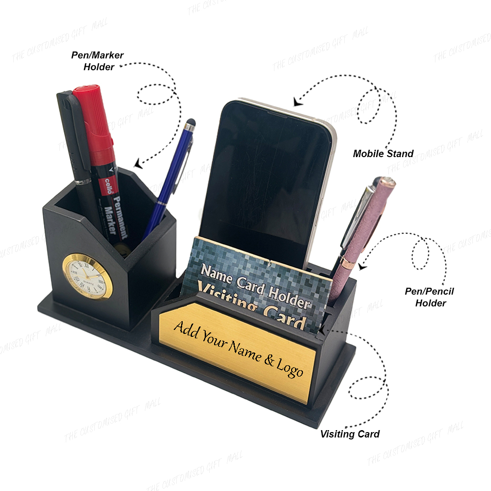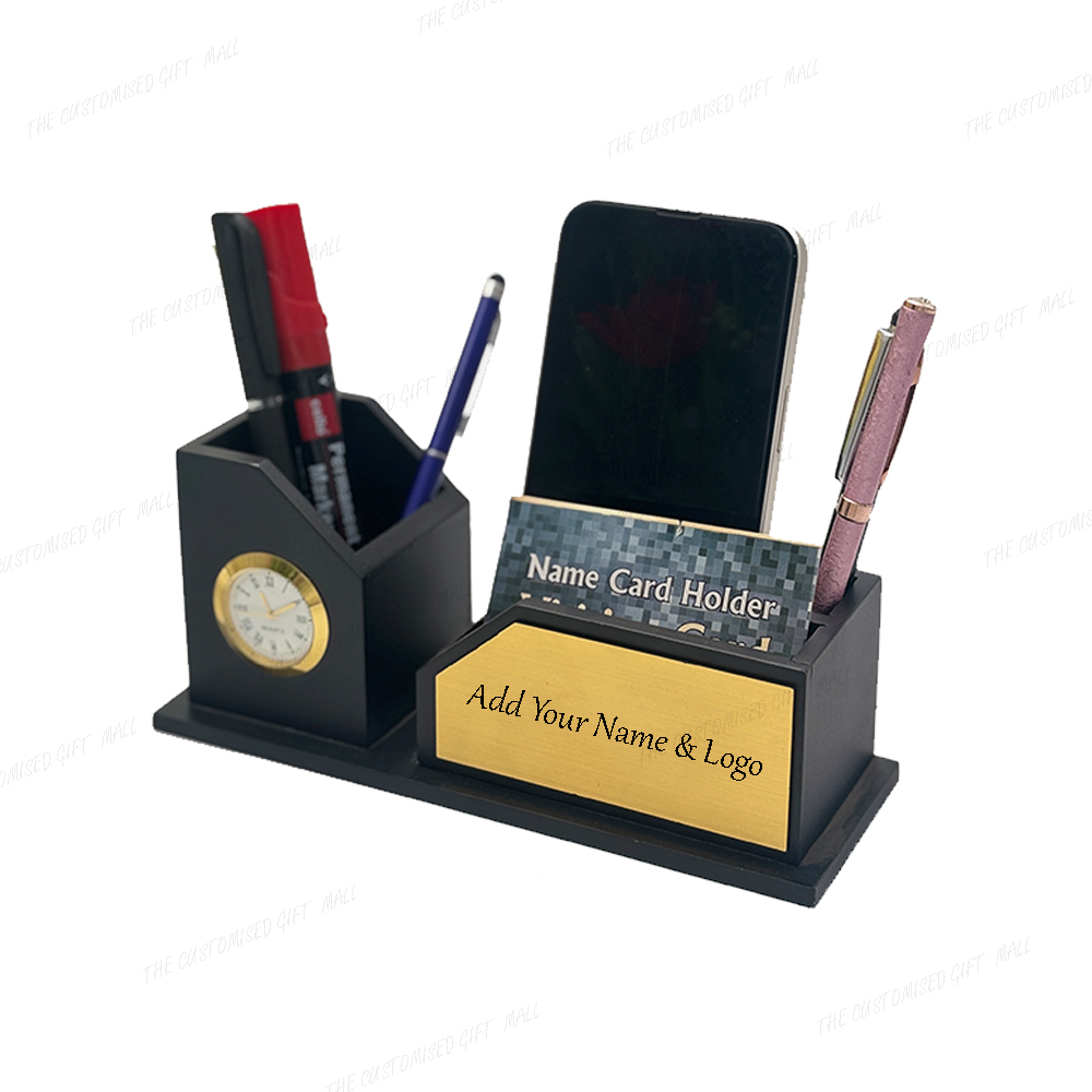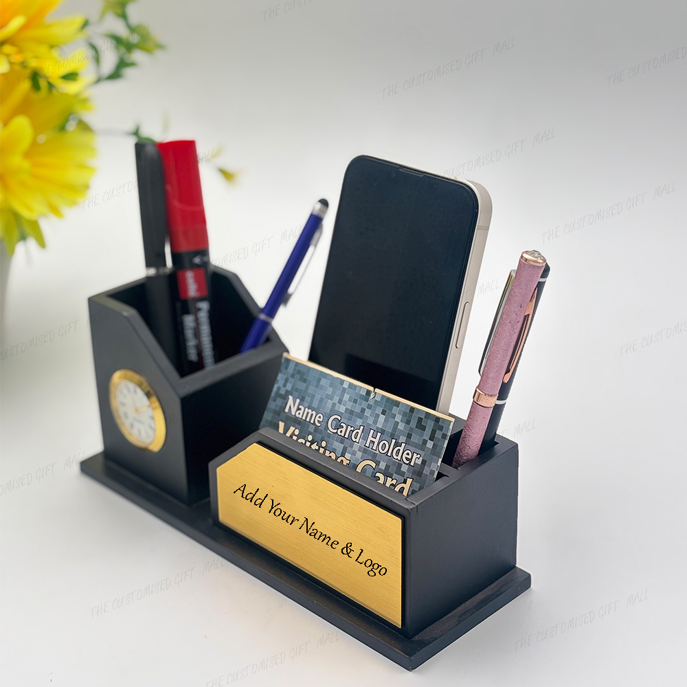 Jovial 4-Compartment Wooden Desk Organizer – Black Pen Stand with Clock, Mobile Holder & Visiting Card Slot with Custom Branding