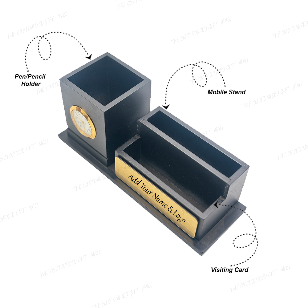 Jovial Wooden Pen Stand with Clock, Mobile Stand, and Card Holder – Black Desktop Organizer with Custom Name (20.2 cm Width)