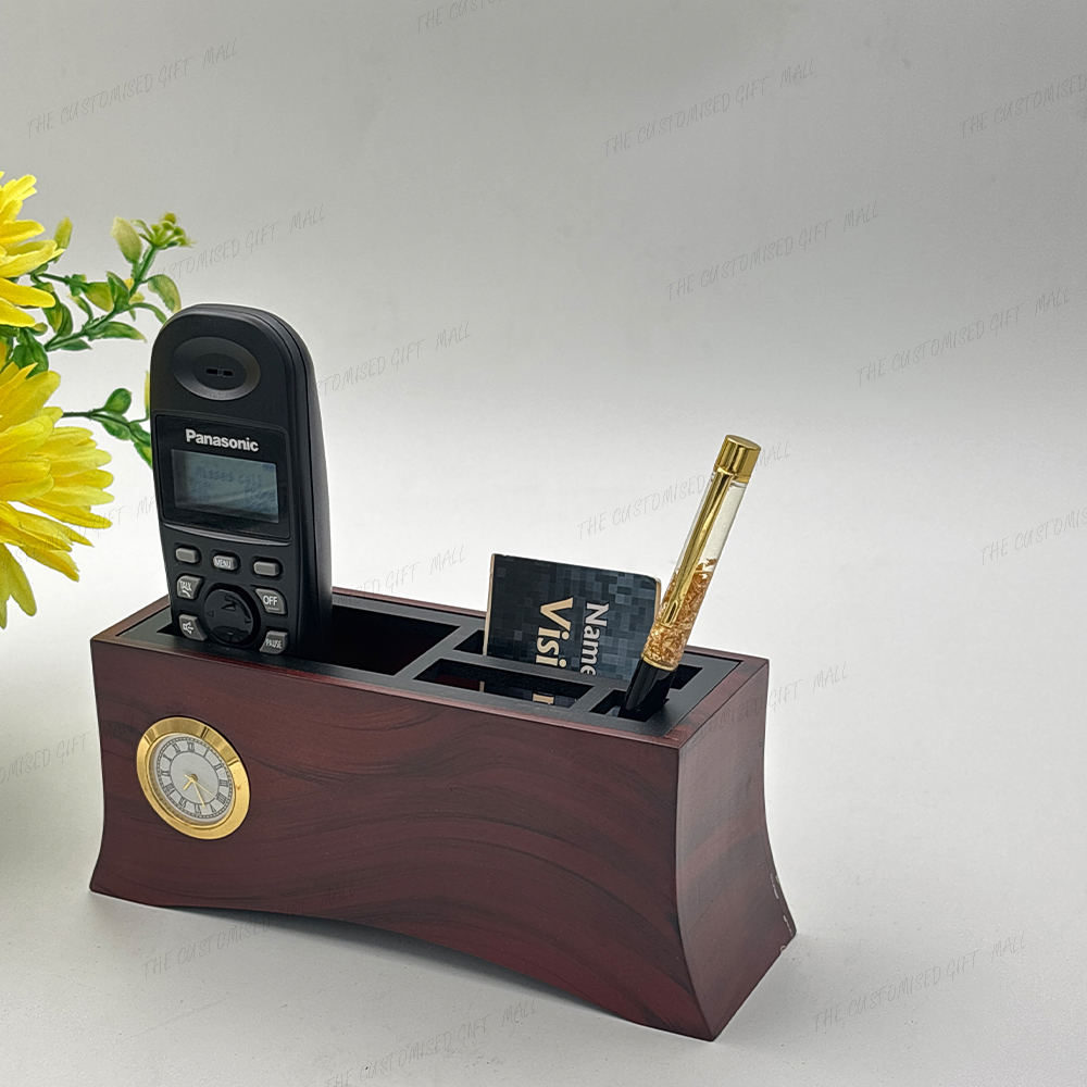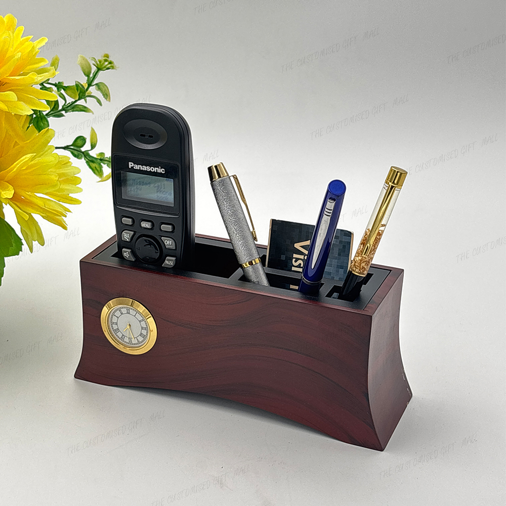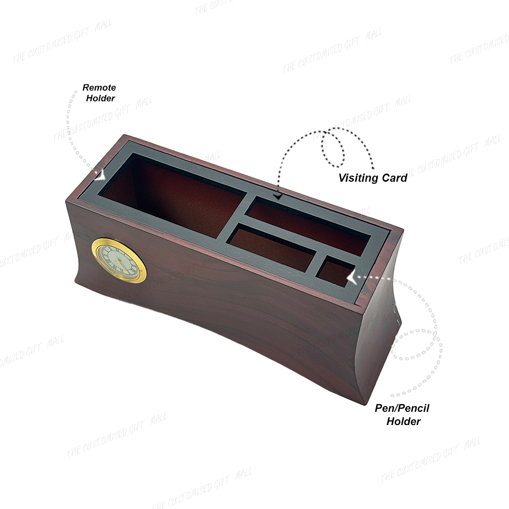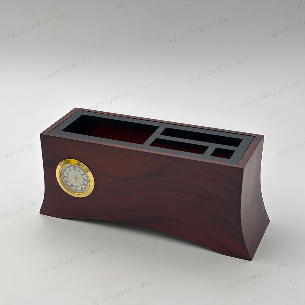 This elegant wooden pen stand features a smooth curved design that adds a touch of sophistication to any workspace. It includes multiple compartments for organizing pens, visiting cards, and remotes, ensuring a clean and efficient desk setup. The built-in golden-rimmed clock enhances its premium look, while the option for laser-marked company branding offers a personalized and professional appeal. Perfect for corporate gifting or office use, this pen stand beautifully combines functionality, durability, and timeless style.