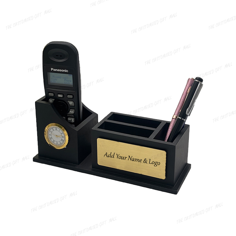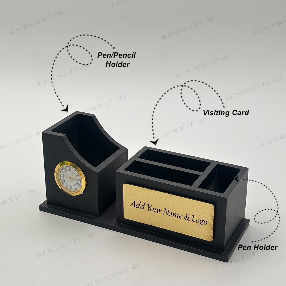 Upgrade your workspace with the Jovial Wooden Desk Organizer with Clock, Mobile & Pen Stand, and Visiting Card Holder. Blending functionality with sophisticated design, it’s more than a desk accessory—it’s a daily productivity partner and a symbol of smart organization.